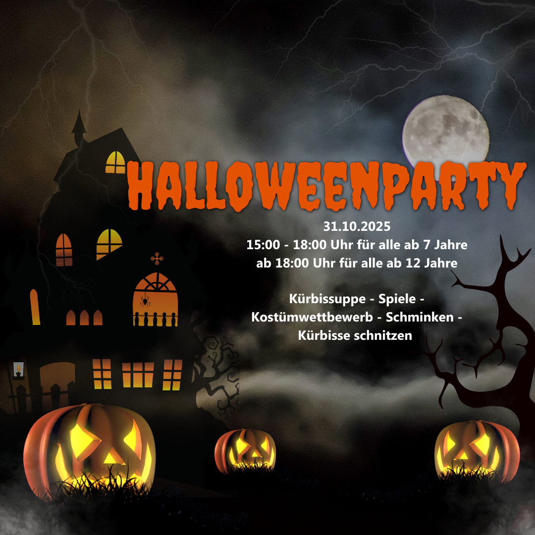 Halloweenparty im JUZ mit Kürbissuppe, Spiele, Kostümwettbewerb, Schminken und Kürbisse schnitzen.