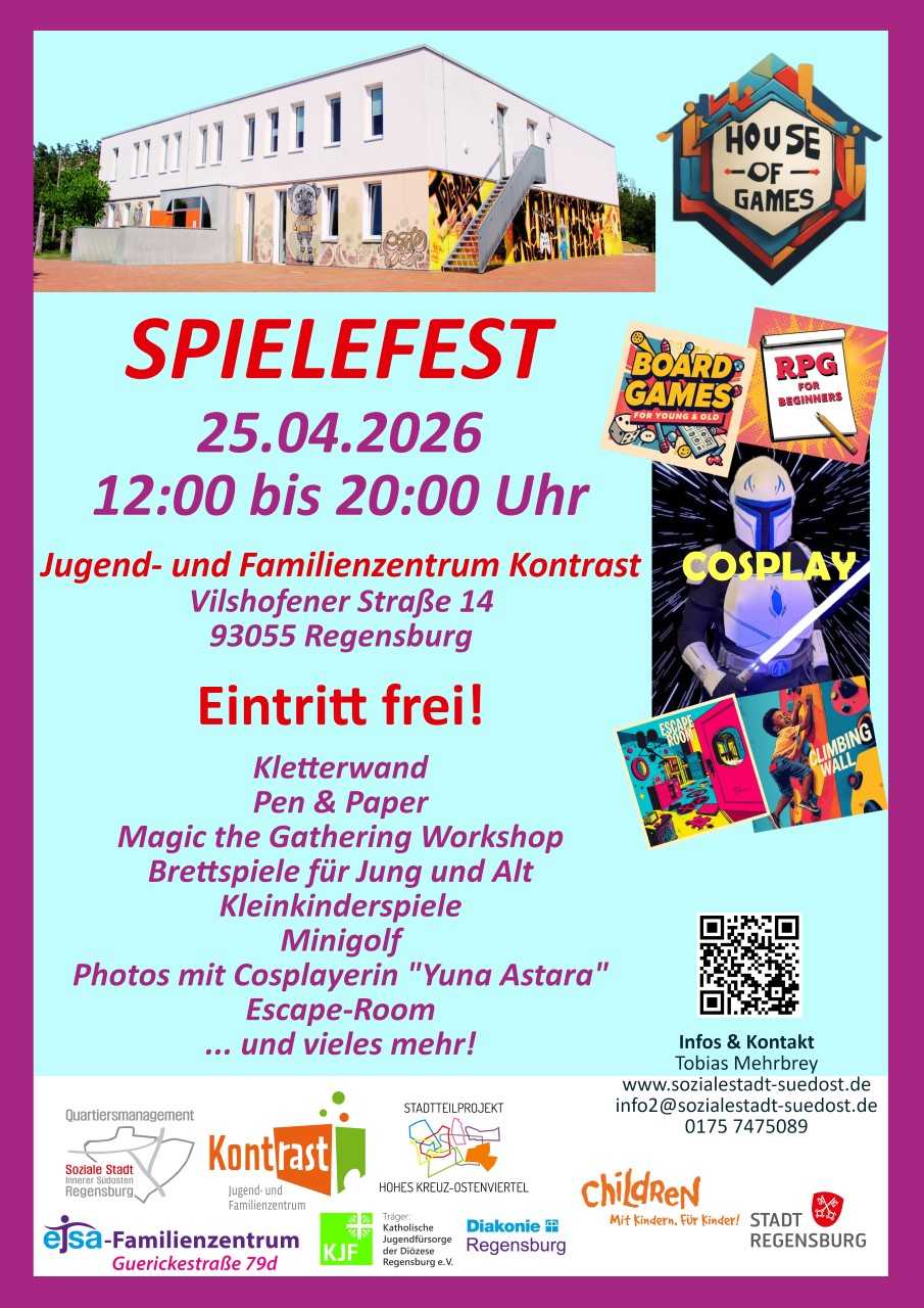 Am 25.04.2026 gibt es das Spielefest „House of Games – Begegnung durch Spielen“ zum dritten Mal im Projektgebiet Innerer Südosten. Dieses Jahr findet es im Hohen Kreuz statt, im Jugend- und Familienzentrum Kontrast, in der Vilshofener Straße 14 in 93055 Regensburg.